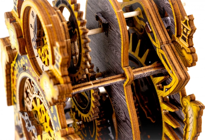 Modellen er lavet af miljøvenlig birkekrydsfiner og samles uden lim eller værktøj. Under samlingen lærer du principperne bag gearudveksling, gummimotorer og urværk på helt tæt hold.