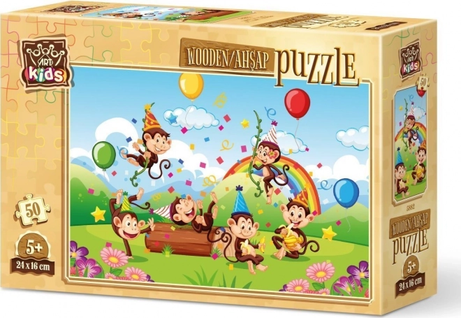Nyd et kvalitets-træpuslespil med et muntert motiv af en abefest. Brikkerne er udstanset af fleksibelt afrikansk træ, hvilket gør dem holdbare og lette at samle. Puslespillet er perfekt til at udvikle finmotorik, logik og tålmodighed.