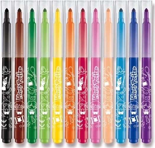 Sæt med 12 farvede tuscher med let aftagelig og vaskbar blæk med attraktive Harry Potter-motiver.