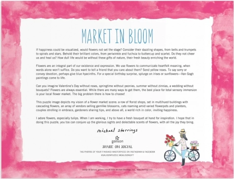 Nyd sjov og kreativitet med puslespillet 'Blomstermarked' af Michael Storrings. Denne skildring af et livligt blomstermarked byder ikke kun på en underholdende puslespilsudfordring, men fungerer også perfekt som dekoration.
