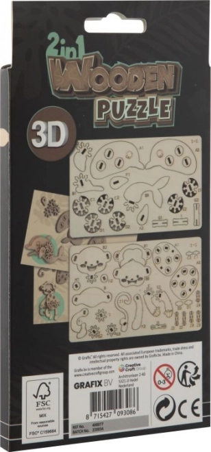 Det træbaserede 3D-puslespil 2-i-1 bringer to attraktive dyremotiver – en abe og en delfin. Takket være præcist udskårne dele kan modellerne samles uden lim, hvor processen er intuitiv og understøttet af en overskuelig billedvejledning. Naturmaterialet giver modellerne et autentisk udseende og en behagelig fornemmelse under samlingen.