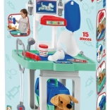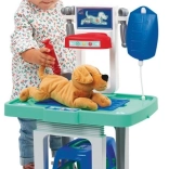Alt, hvad den lille dyrlæge behøver, er inkluderet: behandlingsbord til komfortable undersøgelser, lukbar transportboks til sikker “transport” af patienter og en blød plyshund. Lægeredskaberne – stetoskop, infusionsflaske, termometer og andre hjælpemidler – giver legen autenticitet.