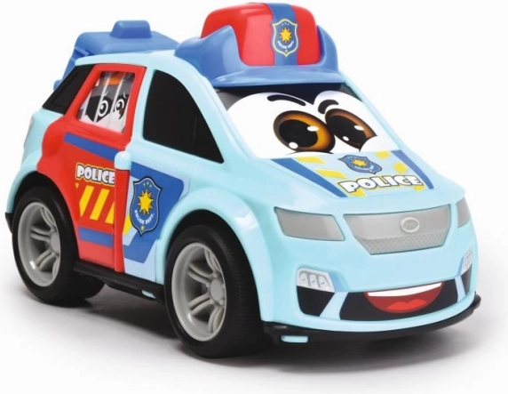 Den blå politibil med smilende ansigt og mærker er perfekt til at opretholde ro og orden på de imaginære gader. Med et spilbart design og politigrafik vil hver børnepatrulje være en fornøjelse.