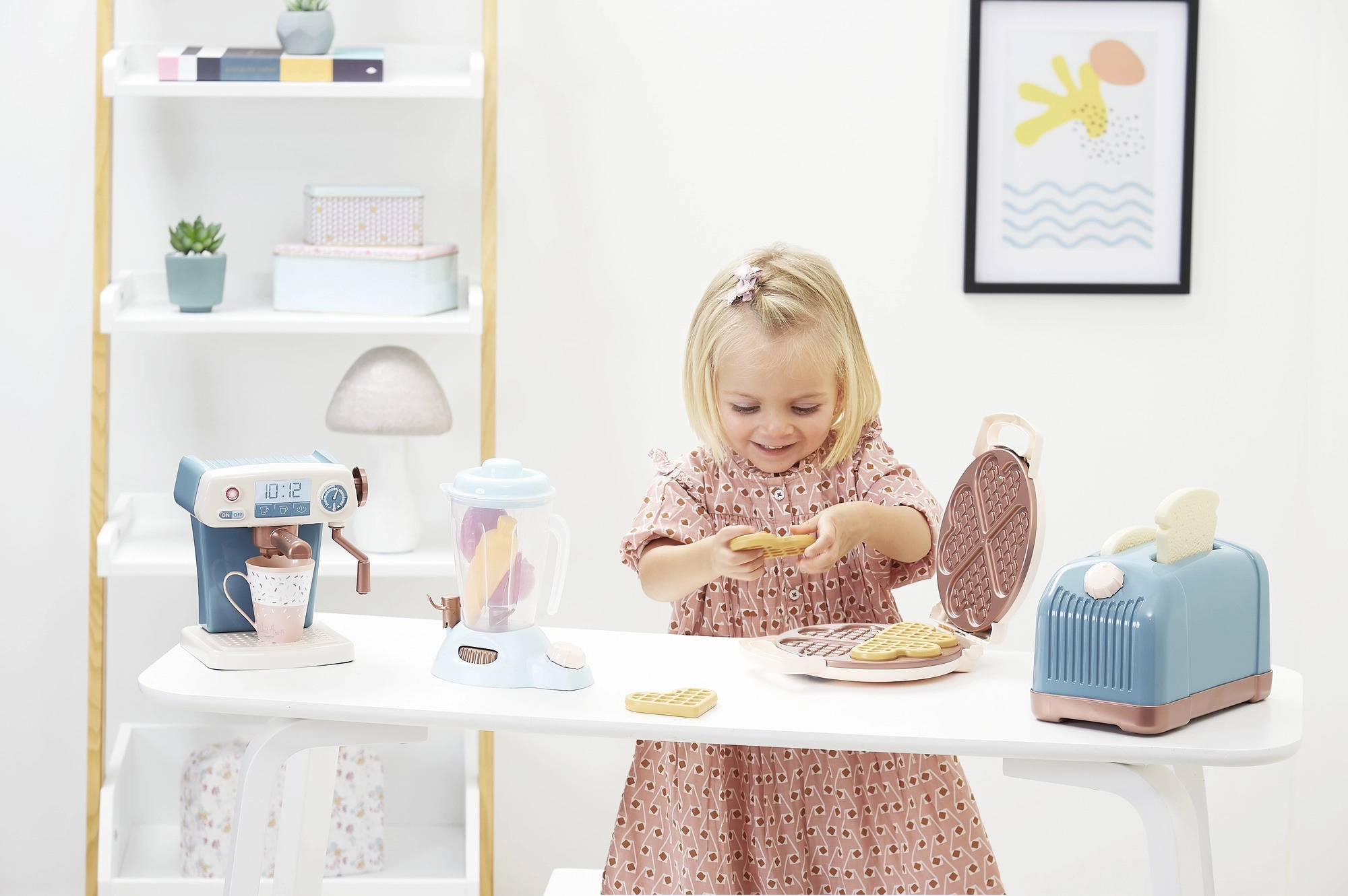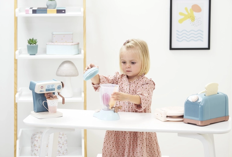 Dette stilfulde sæt til små kokke rummer alt, hvad børn behøver for at efterligne de voksne i køkkenet. Brødrister med “toast”, realistisk kaffemaskine, sødt vaffeljern og gennemsigtig blender indbyder til legende “madlavning”, servering og fælles spisning. Understøtter koncentration, logisk tænkning og hånd‑øje‑koordination.