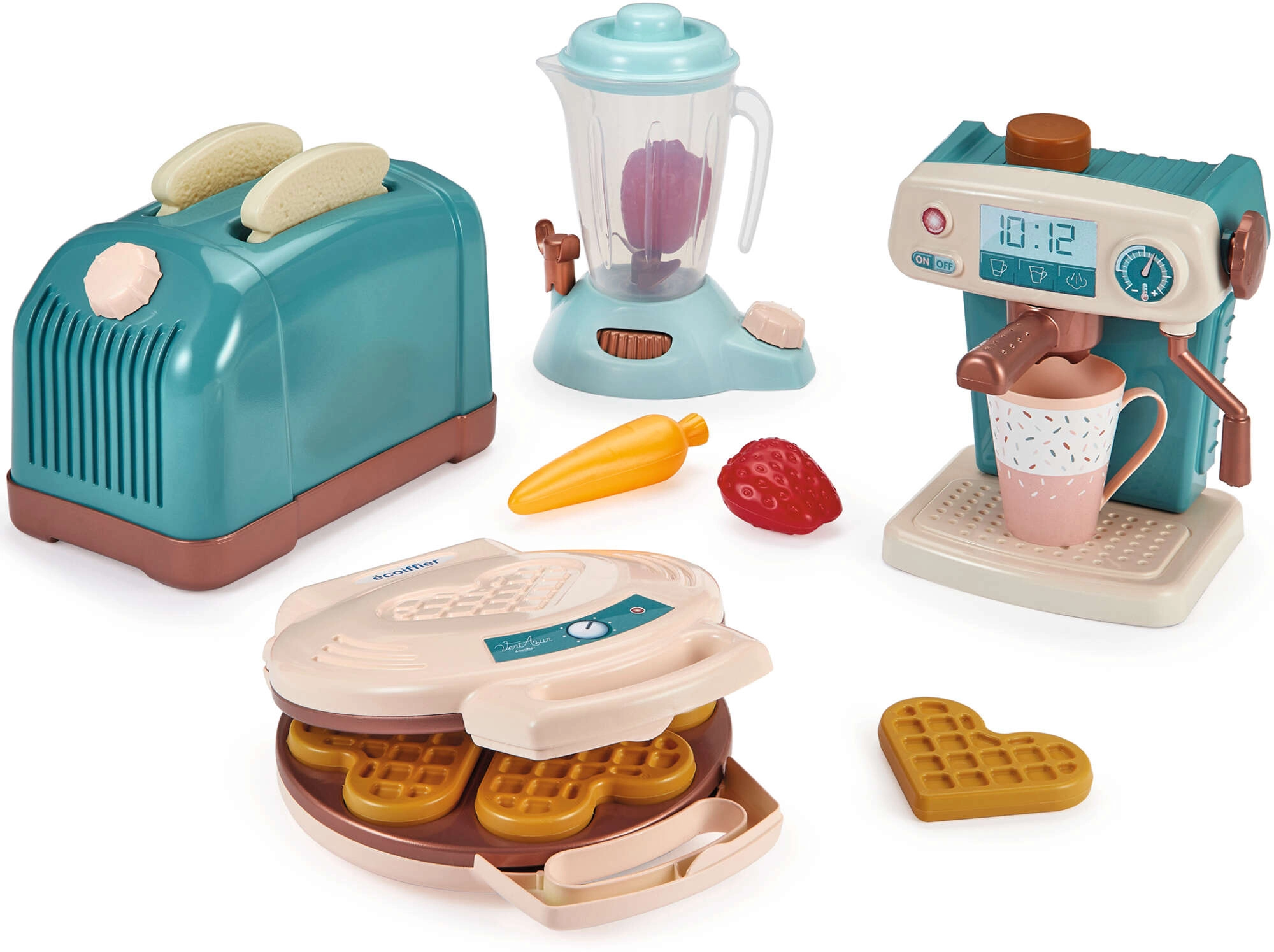 Opdag den kreative madlavningsverden med ECOIFFIER Vert Azur børnekøkkensæt – brødrister, kaffemaskine, vaffeljern og blender suppleret med 15 dele tilbehør. Sættet understøtter fantasi, finmotorik og rolleleg, har bevægelige elementer og er lavet af kvalitetsplast i et moderne blå‑brunt farvetema.