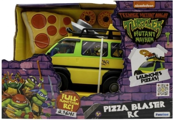 RC-bilen Pizza Blaster er udstyret med 2,4 GHz teknologi for let og jævn kørsel. Med dette køretøj kan du skyde op til 6 skum-pizzaer på dine fjender og nyde en vild kamp som ægte Ninja Turtles! Den sjove fjernbetjening i form af et pizzastykke tilføjer ekstra sjov og enkel kontrol.