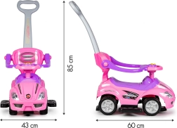 Børnekøretøjet 3i1 Deluxe tilbyder ikke kun et flot design og funktionalitet, men også sikkerhed for de mindste. Dets konstruktion tillader tilpasning efter barnets alder, hvilket garanterer dets vækst med barnet. Lyserød farve og ikonisk design glæder ethvert barn.