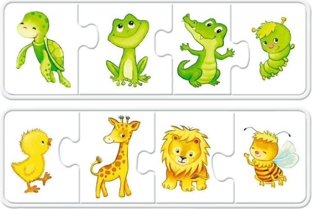 Puslespillet indeholder brikker lavet af ekstra stærkt pap, hvilket sikrer deres holdbarhed og styrke til langvarig brug af børn. Takket være den enkle konstruktion lærer børn nemt at navngive dyr og genkende farver.