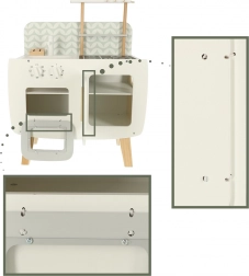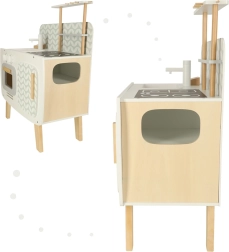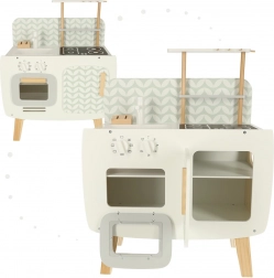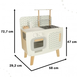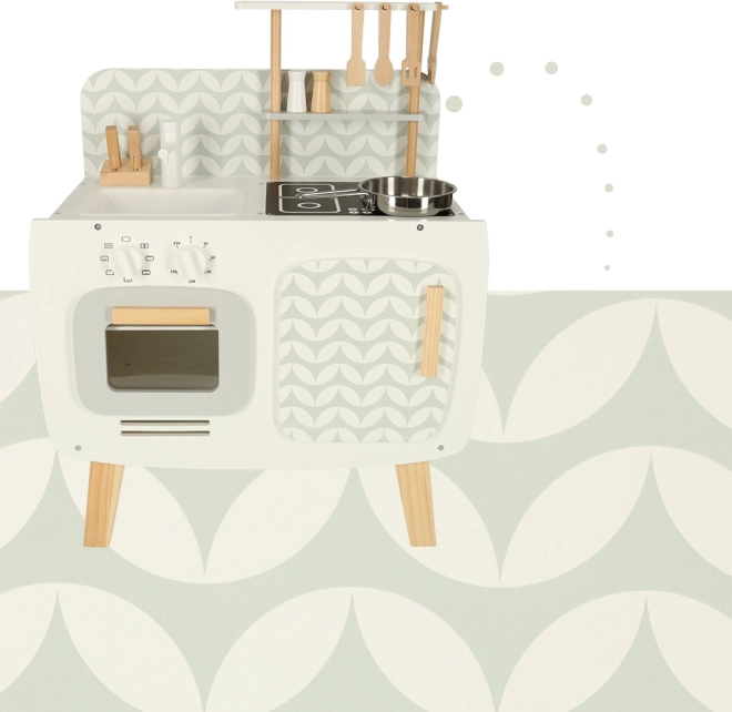 Køkkenets design er enkelt og i bløde pastelfarver, hvilket gør det egnet som et centralt element i ethvert børneværelse både som et legesæt og som en æstetisk tilføjelse.