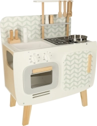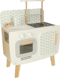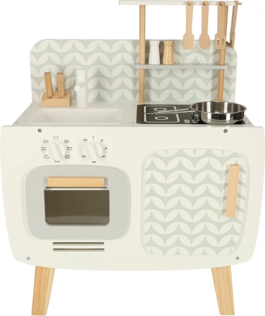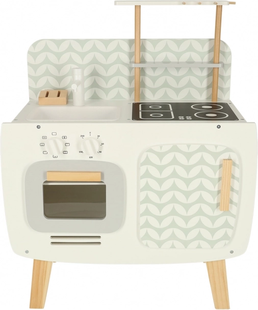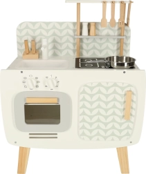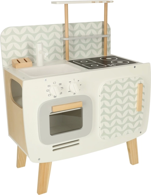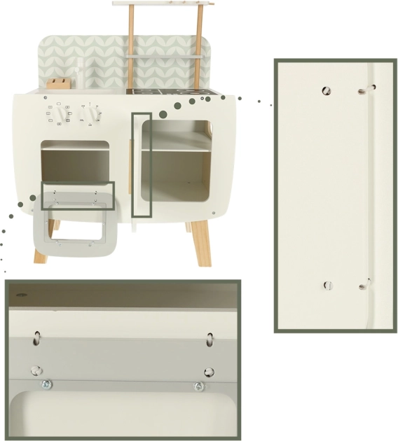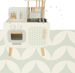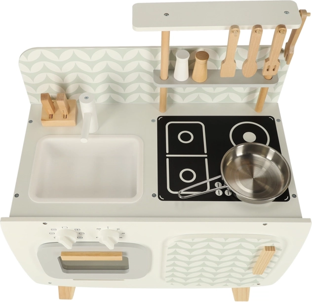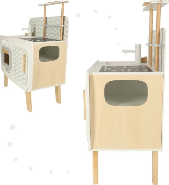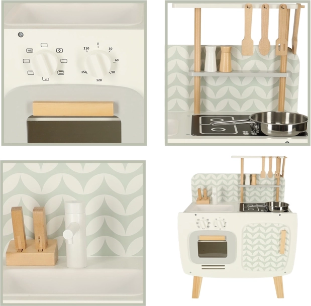 Køkkenet er udstyret med basale apparater, såsom ovn, komfur og vask. Bevægelige dele som drejeknapper giver legen troværdighed, hvilket fremmer større involvering og interesse i kulinariske aktiviteter.