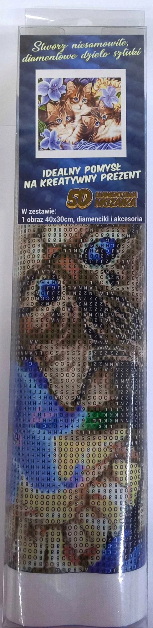 Diamantmaleri – fremgangsmåde: Den øverste side af lærredet er belagt med klæbemiddel og dækket af en gennemsigtig film. Fjern filmen gradvist i sektioner i takt med, at du påfører stenene. Hvis hele filmen fjernes på én gang, kan det klæbende lag blive snavset, og stenene kan hæfte dårligere. Lærredet indeholder symboler, som er angivet i den vedlagte legend og henviser til den relevante pose med sten markeret med et nummer. Hæld stenene fra den valgte pose ud i bakken. Tag voks i spidsen af pennen, så stenene nemt hæfter på pennen. Overfør stenene med pennen til billedet. Når en farve er færdig, hælder du stenene tilbage i posen og fortsætter med den næste farve.