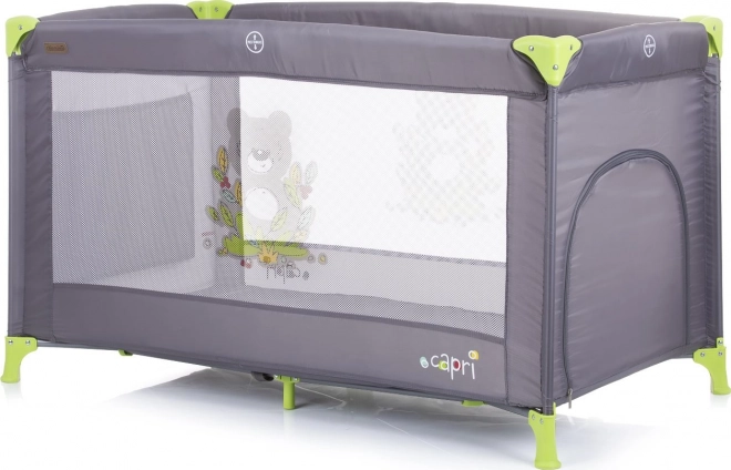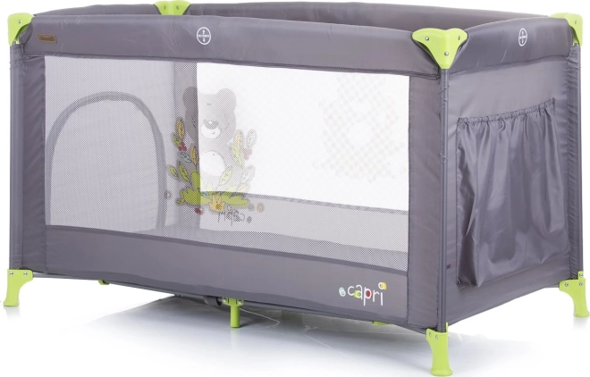 Den praktiske rejseseng Chipolino Capri i varianten Grafit er ideel til daglig brug og ferier. Den tilbyder hurtig og nem foldning, sideindgang med lynlås for barnets selvstændige kravlen ind og ud samt en blød madras for behagelig hvile. To rumlige sidelommer gør det nemt at opbevare småting, og plastbeskyttede kanter øger sikkerheden. Der medfølger en transporttaske for ren og let håndtering. Fremstillet i henhold til EN 716-1.