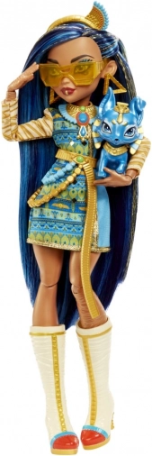 Dukken Cleo De Nile fra Monster High kollektionen stråler i et ikonisk outfit inspireret af det gamle Egypten: blå‑gylden kjole med ærmer, der minder om bandager, suppleret af et kæde‑bælte og knæhøje støvler. Det samlede look understreges af gyldne smykker og stilfulde solbriller.