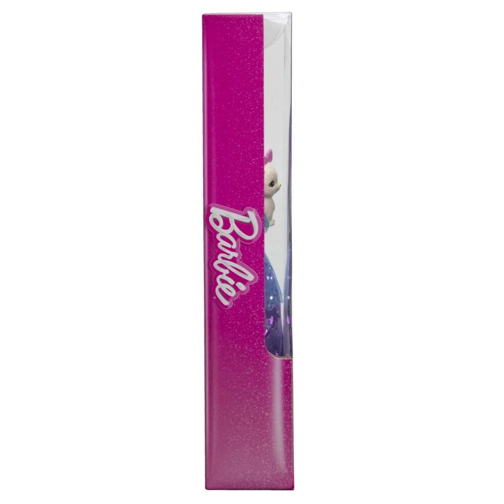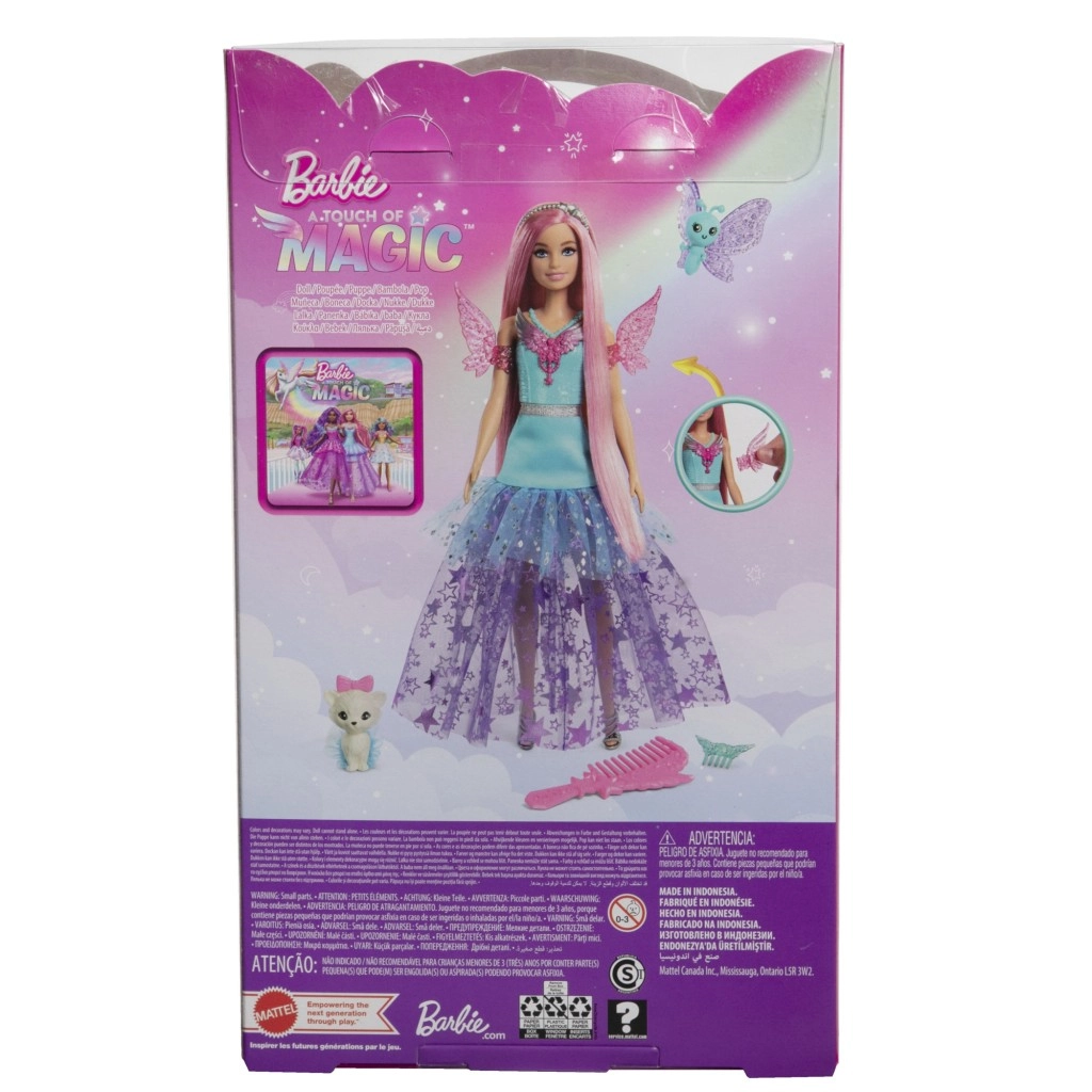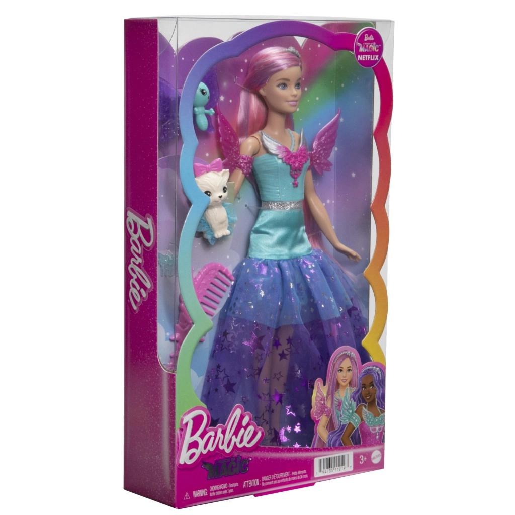 Barbie Malibu fra kollektionen “Barbie og et strejf af magi” stråler i en smuk kjole med stjernetyl, glitrende hårbøjle og aftagelige vinger. De pastellyserøde lokker indbyder til børstning og styling, mens de søde venner – sommerfugl og kæledyr i tutu – udvikler fantasien og rollelegen.
