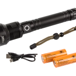 Med en glidende zoom funktion kan man let justere lys keglebredden og rækkevidden op til 1000 m, hvilket øger dens anvendelsesfleksibilitet. Den er drevet af moderne genopladelige batterier for forlænget driftstid.