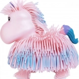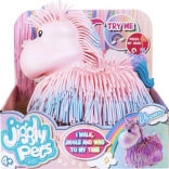 Sød interaktiv enhjørning fra Jiggly Pets, som vækkes til live ved at trykke på knappen på hovedet: den går, nikker med hovedet, vrikker med krop og hale og spiller glade melodier. Den bløde, frynset overflade indbyder til berøring, og batterier er inkluderet (til prøvebrug).