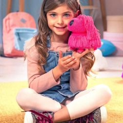 Den søde interaktive hund Jiggly reagerer, når du trykker på knappen på hovedet: den gør, går, nikker med hovedet og vrikker med krop og hale i takt med melodierne. Batterier 2× AA er inkluderet i pakken (testbatterier). Fås i farverne pink, lilla, blå, brun.