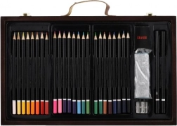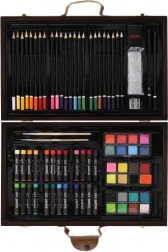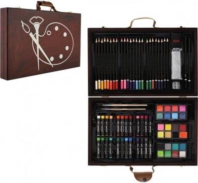 Indeholder farveblyanter, voksfarver, grafitblyanter, akvarelmaling, pensler, blyantspidser og viskelæder - i alt 79 dele af grundlæggende kunstnerbehov.
