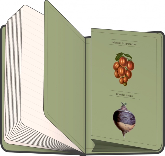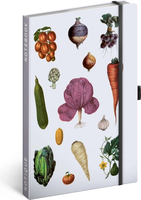 Notesbog med hårdt omslag fra Kateřina Winterovás kollektion med illustrationer af forskelligt grøntsag, med elastiklukning, lomme til småting og holder til blyant. Indeni finder du 172 linjerede sider på gult papir til at nedskrive alle dine idéer.