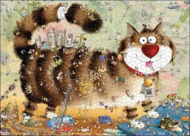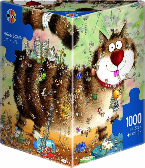 Heye puslespil Katteliv 1000 brikker med humoristisk motiv af Marino Degano. Trekantet æske, plakat som forlæg, størrelse samlet 70 × 50 cm.