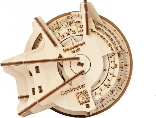 Træbaseret mekanisk kurvemåler fra UGEARS: 109 dele, lav sværhedsgrad, måling af kurver i metriske og imperiale enheder, STEM.org-certificering, AR-app.