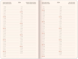 Den ugentlige kolonneopdeling giver rigelig plads til noter hver dag. I kalenderen finder du en oversigt over internationale helligdage, en liste over tjekkiske og slovakiske navne, årsoversigter for 2024 og 2025, en praktisk adressebog samt en lomme på den bagerste inderside af omslaget til småting.