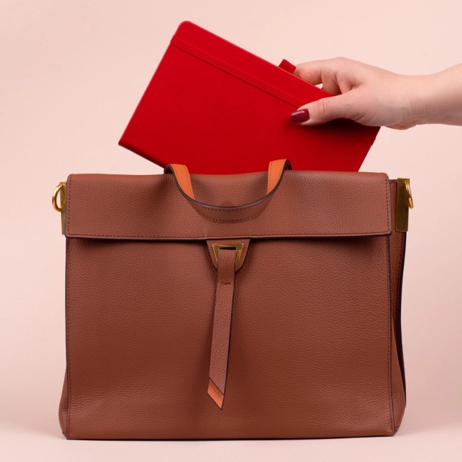 Elegant prikket notesbog i rød med hård bogbinding og praktiske detaljer er ideel til planlægning, skitser og bullet journal. Den tilbyder gult papir med 5 mm prikker, penneholder, elastiklukning og stofbogmærke. Overfladen med grovere struktur muliggør prægning af logo, så den er også perfekt som firmagave.