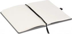 Den elastiske rem holder notesbogen sikkert lukket, stofbogmærket giver hurtig orientering, og penneholderen sikrer, at du altid har skriveredskabet ved hånden.