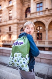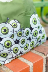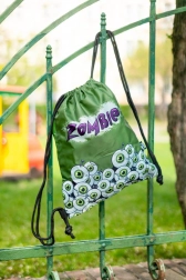Rygsækken er dækket af grafik med grønne tegnede øjne og teksten 'Zombie', hvilket tiltrækker opmærksomhed og giver et personligt præg.