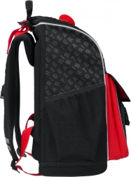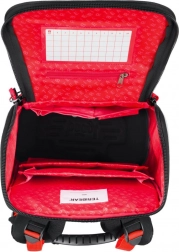 Den vippende åbningsmekanisme giver adgang til taskens indhold direkte fra skolebordet. En indvendig organizer med elastik og en lomme med skema holder skolegrej overskueligt på plads.