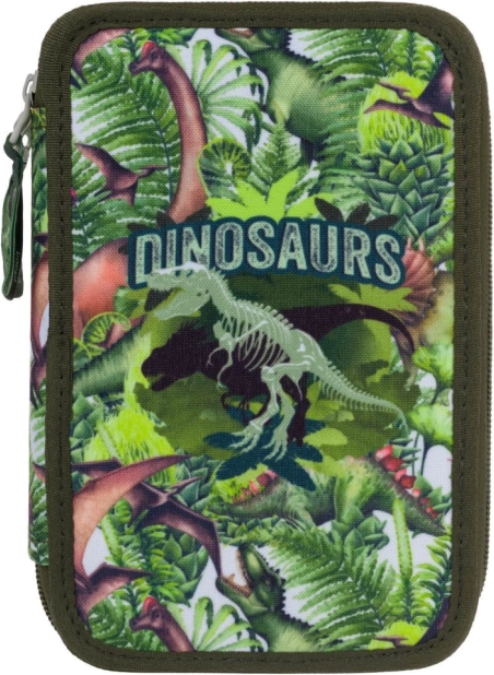 Dette penalhus tilbyder et unikt dinosaurtema med markante grønne og brune bladmønstre.