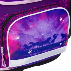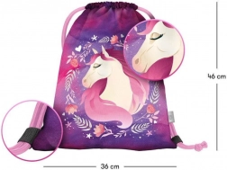 Stilfuldt skolesæt med hestemotiv til de mindste skolebørn fra 1. klasse. Indeholder ergonomisk skoletaske, rummeligt penalhus og praktisk pose til sko. Skoletasken har ergonomisk formet ryg og justerbart ERGO ADJUSTABLE SYSTEM for perfekt tilpasning, magnetisk Fidlock-lukning for nem åbning, reflekterende elementer for sikkerhed og lav vægt under 1.200 g. Sættet imponerer med høj kvalitet, vandafvisende materialer og et smukt lilla-rosa design med hestemotiver.