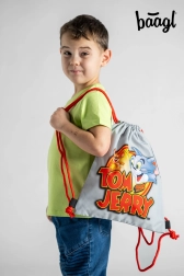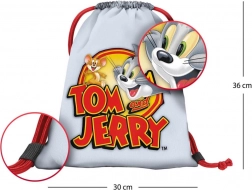 Stilfuld førskolepose med Tom & Jerry-motiv, ideel til sko eller små personlige ejendele. Fremstillet af slidstærkt materiale med praktiske snørelukninger.
