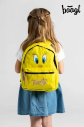Rygsækken skiller sig ud med sin klare gule farve og Tweety motiv, hvilket er attraktivt for små børn.