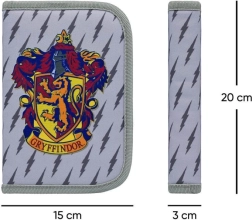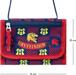 Penalhus med to flapper, pose til skiftesko med frontlomme med lynlås, mapper til hæfter og hals-pung – alt i farverne og med våbenskjoldet fra Gryffindor.