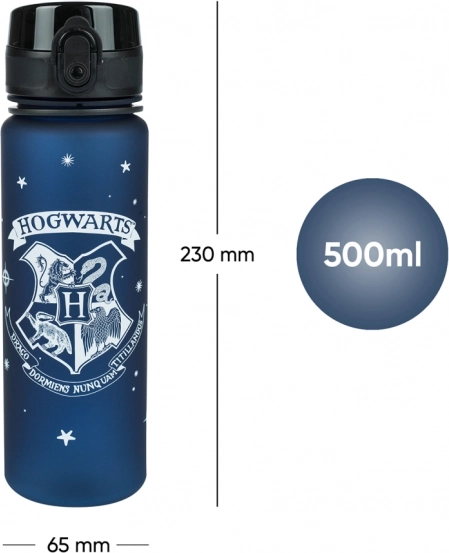 Stilfuld drikkeflaske af tritan med motiv af Hogwarts / Galtvort rummer 500 ml, har et låsbart, lækagesikkert låg, et praktisk håndledsrem og et siindsats til frugt eller te. Fremstillet af certificeret BPA-fri tritan – lugtfri, let og holdbar.