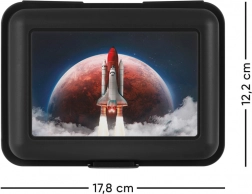 Denne plastik frokostboks har et låg med rumtema, der viser opsendelsen af en rumfærge med en planet i baggrunden.