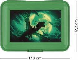 Denne praktiske madkasse er den ideelle løsning til daglig opbevaring af dine yndlingsmåltider. Med et stilfuldt design af en drage der flyver mod fuldmånen holder den ikke kun din mad frisk, men er også visuelt iøjnefaldende. Nem lukning med én lås og indvendig opdeler betyder, at hvert stykke mad forbliver på sin plads.