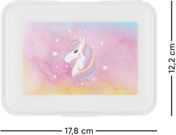 Giv dine børn en praktisk og sjov måde at holde deres frokost eller snack frisk og velsmagende med denne stilfulde boks. Boksen med smukt Rainbow Unicorn-motiv er lavet af holdbar plast, der sikrer lang levetid.