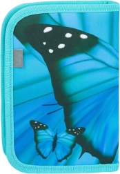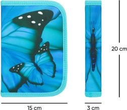 Det elegante penalhus i turkisblå med et markant sommerfuglemotiv kombinerer stil og funktionalitet. Takket være to indvendige flapper, gummistropper og lommer har du altid skriveredskaber og små skoleartikler organiseret og sikkert lukket med lynlås.