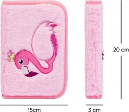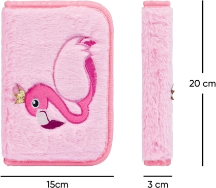 Forsiden prydes af en broderet flamingo med krone på en blød plys-overflade, som er behagelig at røre ved og gør penalhuset til et originalt tilbehør.
