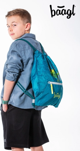 Praktisk pose til sko og fritidsaktiviteter fra mærket BAAGL med motivet T‑REX. Den tilbyder stærkt, aftørringsvenligt materiale, forlomme med lynlås til småting, snorelukning med robuste snore til bæring på ryggen og en karabinhage til nem fastgørelse på skoletaske.