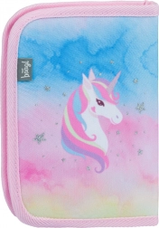 BAAGL Rainbow Unicorn penalhus med ét lag kombinerer et sødt design med praktisk indretning. To indvendige flapper med stropper holder blyanter, kuglepenne og små skoleartikler pænt organiseret. Det holdbare tekstil og den kvalitets lynlås sørger for lang levetid og sikker lukning.