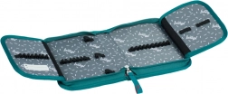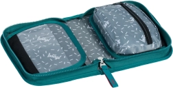 Skolepenalhuset er fremstillet af holdbart tekstilmateriale, som sikrer lang levetid. Den robuste overflade er dekoreret med et dekorativt mønster for øget visuel attraktivitet.