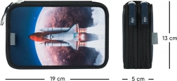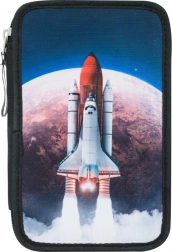 To-etagers penalhus Space Shuttle tilbyder en forstærket ryg, let at håndtere, med kvalitetselastikker der også kan rumme tykke farveblyanter. Indeholder også en lille lomme til småting.