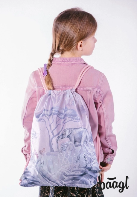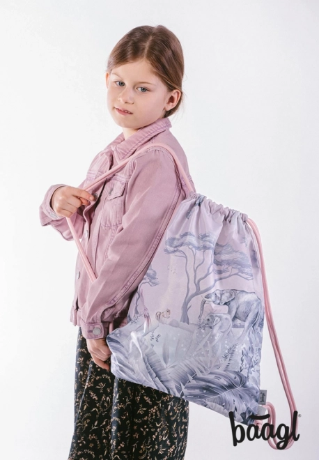 Skolepose til fodtøj Safari er lavet af robust, vaskbart materiale, har en karabinhage til nem fastgørelse til skoletasken og en snørelukning til rygbæring. Stilfuldt komplementerer hele sættet.