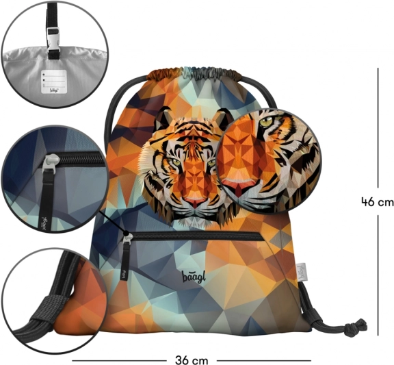 Praktisk pose med tigermotiv fra Baagl, ideel til fritidsaktiviteter eller som skoletaske–pose, giver nem transport takket være justerbare snore og en praktisk lynlåslomme til organisering af småting.