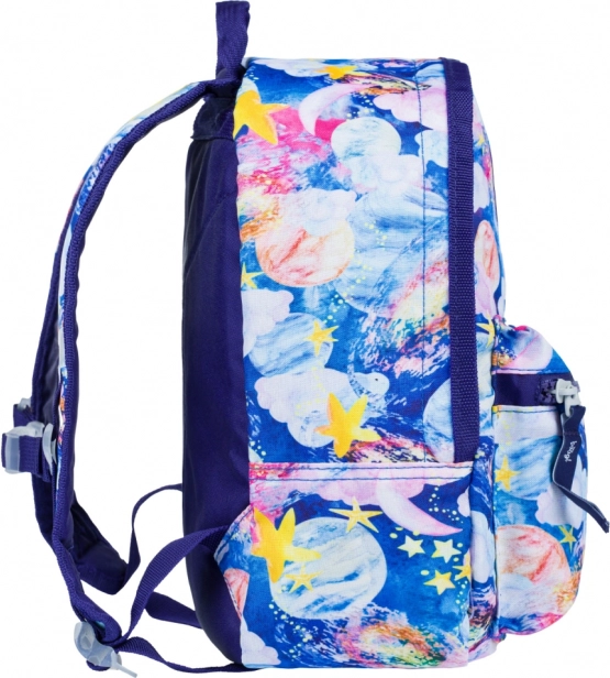 Farverige stjerner, planeter og skyer på en blå baggrund begejstrer ethvert barn og giver rygsækken et originalt udtryk, der skiller sig ud i børnehaven og på ture.