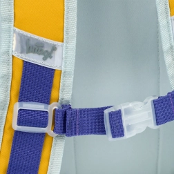 Faste, polstrede rygpaneler og længdejusterbare polstrede skulderremme skåner barnets ryg og sikrer stabilitet.