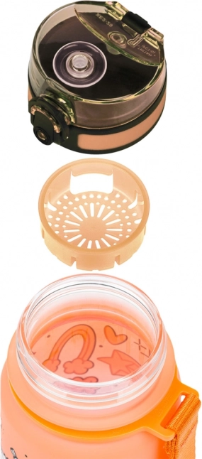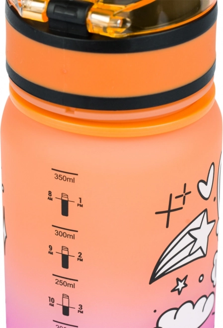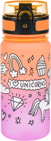 Stilfuld tritan drikkeflaske med volumen 350 ml, enhjørningemotiv og farvegradient – ideel til skole, udflugter og sport. Har sikkert låsbart låg, praktisk bærestrop og indre si til frugt eller urter. Fremstillet af certificeret BPA-fri tritan, lugtfri og egnet også til varme drikke.
